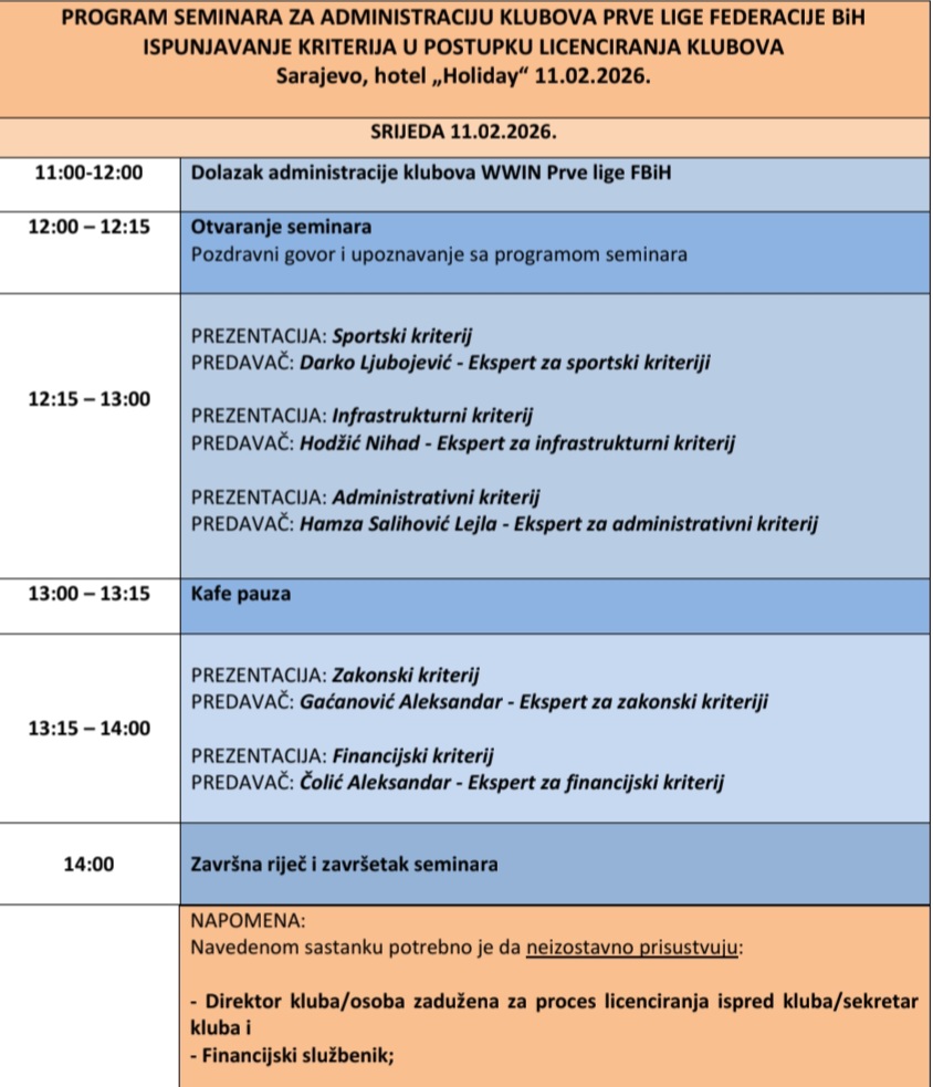 Seminar za klubove WWIN Prve lige FBiH počinje u 12:00 sati, a program seminara možete pogledati ispod.