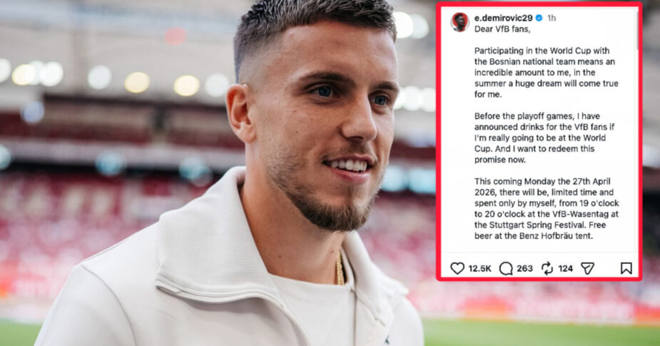 “Dragi navijači Stuttgarta, učestvovanje na Svjetskom prvenstvu sa reprezentacijom Bosne mi nevjerovatno znači, ovog ljeta će mi se ostvariti ogroman san. Prije utakmica baraža najavio sam pića za navijače ako ću se s reprezentacijom plasirati na Svjetsko prvenstvo i sada želim ispuniti to obećanje. Idućeg ponedjeljka, 27. aprila 2026. u periodu od 19 do 20 sati u VfB-Wassentagu na Proljetnom festivalu u Stuttgartu čekat će vas besplatno pivo u Benz Hofbräu šatoru. Također, djeca će na jednom od narednih javnih treninga naše ekipe imati besplatne sladolede. Također odlučio sam finansijski podržati VfB fondaciju Brustring der Herzen (Prsten srca na grudima). Mnogo se veselim što ću vas vidjeti u ponedjeljak na Proljetnom festivalu, Vaš Medo.” napisao je Demirović na Instagramu.